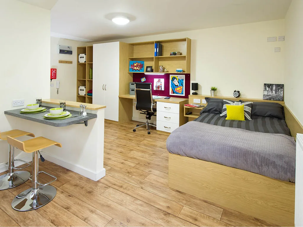 All rooms at Quebec House student accommodation you will find are well furnished and thoughtfully designed to ensure that you have a peaceful study environment. Each room comes with a small double bed, a spacious workstation, a personal TV, well-organised storage for all your personal belongings. You will also have a fully fitted kitchenette and dining room, great to host your friends and a personal shower for no more long queues. Come home to relaxing and unwinding in the social room with a TV, so that you do not miss your regular shows. If you are in the mood then you could also play a game of pool with your friends, the loser could cook. Now would that not be great. There is a bike storage at the property for your bike and the regular social events will ensure that you have great opportunities to meet new people and make friends.